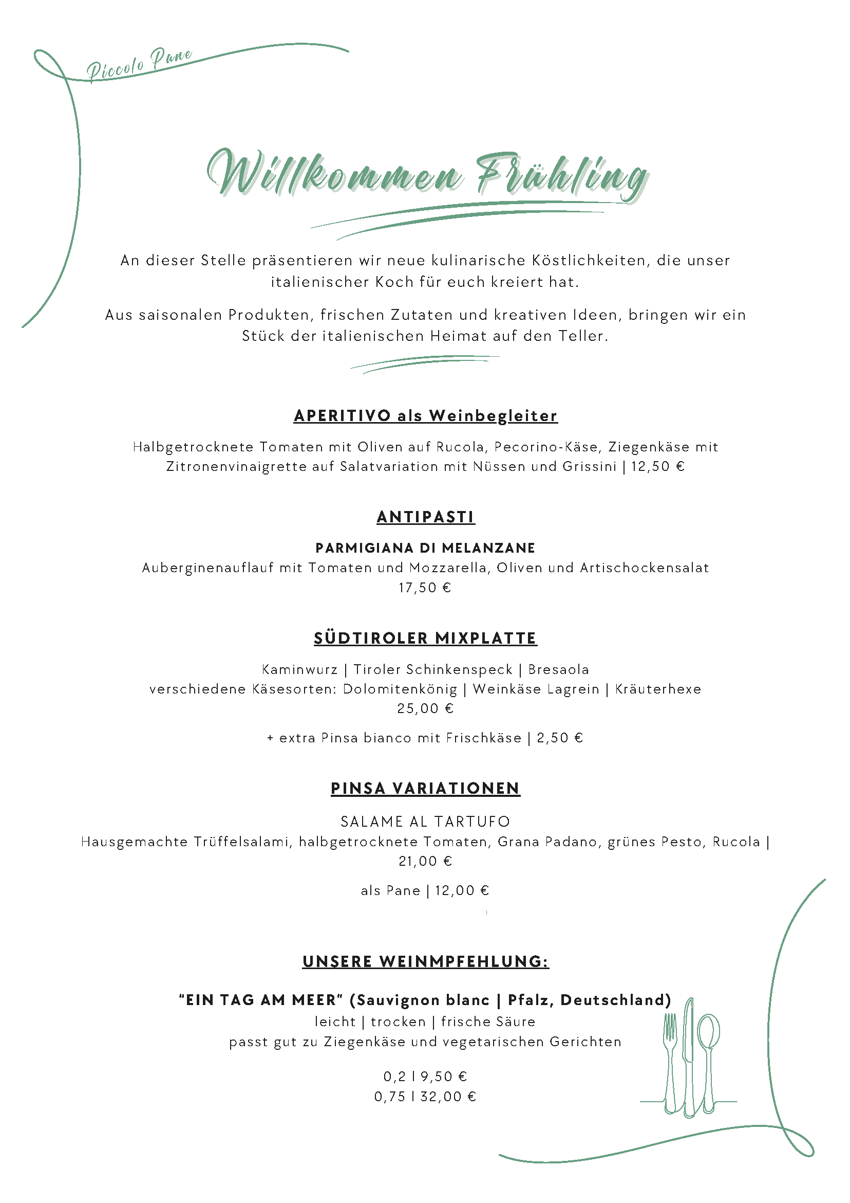 UN PICCOLO MONDO ITALIANO NEL QUARTIERE OLANDESE – Um genauer zu sein aus der Emilia Romagna: Piccolo Pane ist ein ohne Fett gebackenes italienisches Fladenbrot mit ausgesuchten Füllungen mediterraner Art. Unsere hausgemachten Pane werden vor Ihren Augen auf einer heißen Eisenplatte frisch zubereitet. Das ambitionierte und engagierte Team des Piccolo Pane kredenzt Ihnen dazu ausgesuchte Weine und unser gesundes ´Sanssouci´-Mineralwasser. Wir führen die hochwertigen ´Fritz´- und ´Thomas Henry´ Limonaden und gerne servieren wir unsere hausgemachten Nachspeisen Panna Cotta im Glas oder die köstliche Schoko-Tarte.